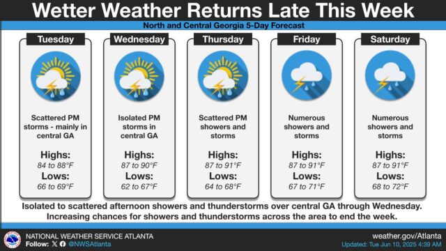 “Only isolated to scattered showers and thunderstorms each day, primarily across central Georgia,” according to a 5:00 a.m. advisory. “Severe weather is not expected. Wetter weather will return from late week into the weekend.”