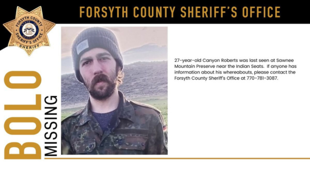 A Be on the Lookout alert has been issued by the Forsyth County Sheriff’s Office for a missing man, 27-year old Canyon Roberts, last seen near the Indian Seats at the Sawnee Mountain Preserve.