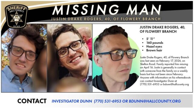 Justin Drake Rogers, 40, of Flowery Branch was last seen on February 17, 2026, on Skelton Road. Family reported him missing on April 16. Justin is generally in contact with someone from the family on a weekly basis but has not been since February. Anyone with information on his whereabouts can contact Investigator Dunn at (𝟳𝟳𝟬) 𝟱𝟯𝟭-𝟲𝟵𝟱𝟯 𝗼𝗿 𝗯𝗱𝘂𝗻𝗻@𝗵𝗮𝗹𝗹𝗰𝗼𝘂𝗻𝘁𝘆.𝗼𝗿𝗴