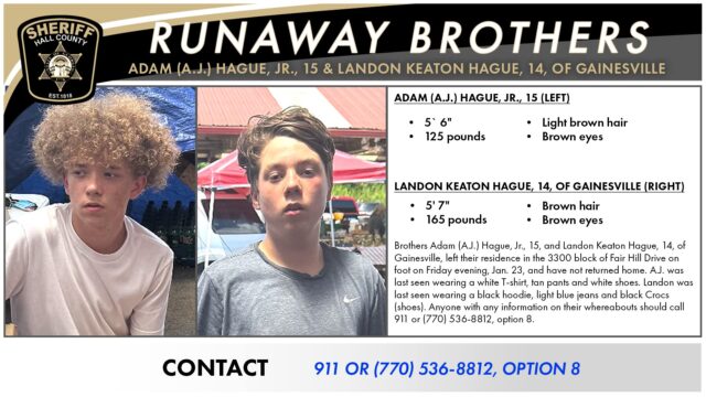 Brothers Adam (A.J.) Hague, Jr., 15, and Landon Keaton Hague, 14, of Gainesville, left their residence in the 3300 block of Fair Hill Drive on foot on Friday evening, Jan. 23, and have not returned home. A.J. was last seen wearing a white T-shirt, tan pants and white shoes. Landon was last seen wearing a black hoodie, light blue jeans and black Crocs (shoes). 𝗔𝗻𝘆𝗼𝗻𝗲 𝘄𝗶𝘁𝗵 𝗮𝗻𝘆 𝗶𝗻𝗳𝗼𝗿𝗺𝗮𝘁𝗶𝗼𝗻 𝗼𝗻 𝘁𝗵𝗲𝗶𝗿 𝘄𝗵𝗲𝗿𝗲𝗮𝗯𝗼𝘂𝘁𝘀 𝘀𝗵𝗼𝘂𝗹𝗱 𝗰𝗮𝗹𝗹 𝟵𝟭𝟭 𝗼𝗿 (𝟳𝟳𝟬) 𝟱𝟯𝟲-𝟴𝟴𝟭𝟮, 𝗼𝗽𝘁𝗶𝗼𝗻 𝟴.”