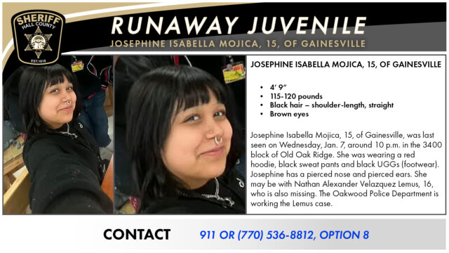 Josephine Isabella Mojica, 15, of Gainesville, was last seen on Wednesday, Jan. 7, around 10 p.m. in the 3400 block of Old Oak Ridge. She was wearing a red hoodie, black sweat pants and black UGGs (footwear). Josephine has a pierced nose and pierced ears. She may be with Nathan Alexander Velazquez Lemus, 16, who is also missing. The Oakwood Police Department is working the Lemus case. Anyone with information on the whereabouts of Josephine or Nathan, should call ๐ต๐ญ๐ญ ๐ผ๐ฟ (๐ณ๐ณ๐ฌ) ๐ฑ๐ฏ๐ฒ-๐ด๐ด๐ญ๐ฎ, ๐ผ๐ฝ๐๐ถ๐ผ๐ป ๐ด.”