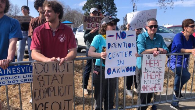 Protesters gathered in downtown Gainesville to rally against that proposed Oakwood ICE detention/processing center.