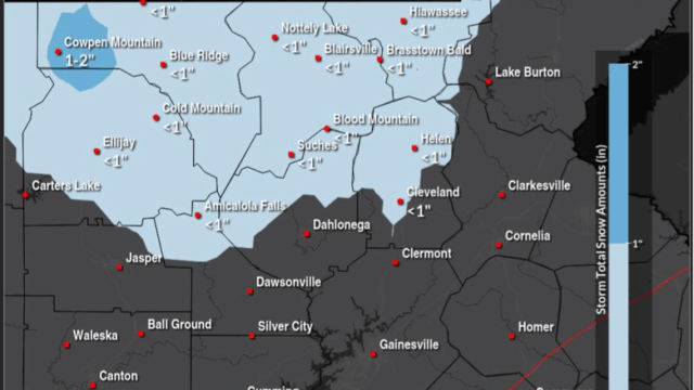 “A brief burst of snow showers is expected in the mountains of northeast Georgia Monday afternoon,” a Monday morning advisory from the National Weather Service (NWS) says. “Light accumulations may be possible on grassy and elevated surfaces, especially at elevations over 2,000 ft. Be prepared for slick bridges and overpasses. Slick spots may linger through Tuesday morning where accumulations occur.”