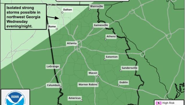 The best chance for any strong storms is along and southeast of a line from Blairsville to Rome.