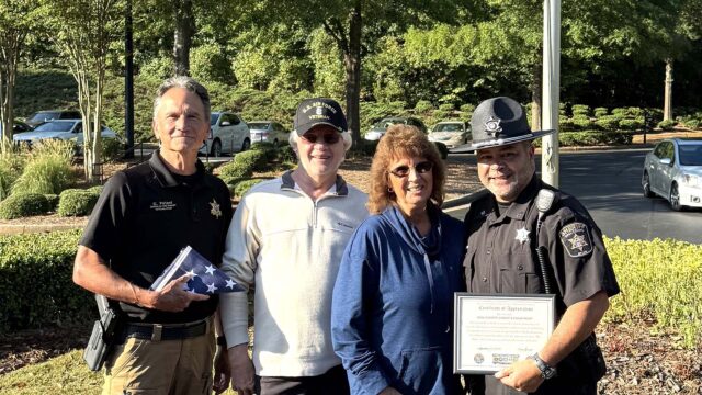 Thursday, on the 24th anniversary of 9/11, Community Service Officers Mike Burgamy and Chuck Poteet of the Hall County Sheriff’s Office accepted a commemorative American flag from Rick and Patti Hardin.