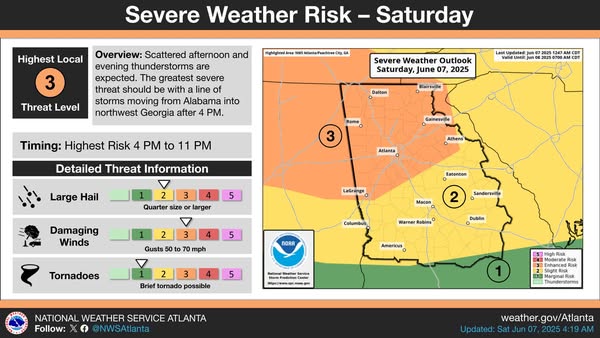 All of north Georgia is now at Level 3 as “confidence continues to increase in a line of thunderstorms moving into north and central Georgia from late afternoon through the evening hours,” according to the National Weather Service (NWS). In those parts of the state the window of greatest concern is 4:00 p.m.-11:00 p.m.