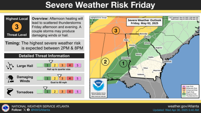 The Gainesville area may have escaped any of the predicted severe weather overnight (parts of northwest Georgia including Rome got hit hard) but the threat for today remains – primarily between 2:00 and 8:00. The National Weather Service (NWS) says that includes large hail, damaging winds, and tornadoes.