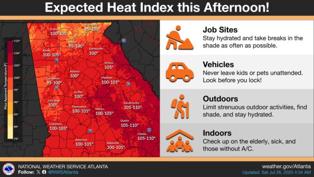 From Rabun Gap to Tybee Light, Georgians are in store for a triple-digit heat index day statewide today. And the National Weather Service (NWS) has issued a Heat Advisory for central and south Georgia and a few counties in north Georgia.