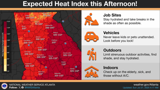 Another Heat Advisory is in place for counties adjacent to Hall to the southeast – Barrow, Jackson and Banks. They are on the leading northwest edge of the affected areas covered by the posting – virtually the remainder of the state.