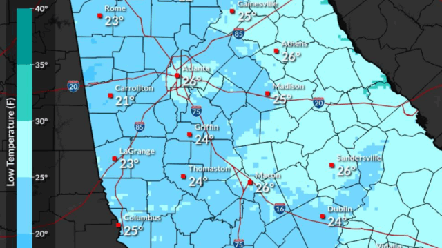 It now includes Tuesday morning and areas as far south as Americus, Abbeville and Dublin where lows of up to 25 can be expected Tuesday morning. The same is forecast for Gainesville and vicinity with teens expected in the mountains of northeast Georgia.