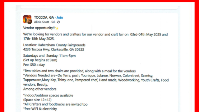 “It has been brought to our attention that a post has been made trying to get the public to sign up for a craft fair at the Habersham County Fairgrounds on May 3-4 and May 17-18,” the message reads, “please be aware WE DO NOT HAVE ANY EVENT OF THIS TYPE BOOKED AT THE FAIRGROUNDS FOR THESE DATES.”